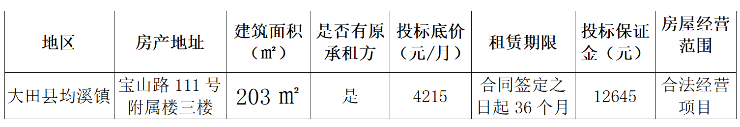 中國郵政集團(tuán)有限公司福建省大田縣分公司(招租人)就大田縣均溪鎮(zhèn)寶山路111號(hào)附屬樓三樓房產(chǎn)對(duì)外公開招租,歡迎有意向的機(jī)關(guān)、團(tuán)體、個(gè)人前來響應(yīng)報(bào)價(jià)。 一、招租內(nèi)容