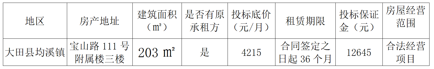 中國郵政集團有限公司福建省大田縣分公司(招租人)就大田縣均溪鎮(zhèn)寶山路111號附屬樓三樓房產(chǎn)對外公開招租(第二輪),歡迎有意向的機關、團體、個人前來響應報價。 一、招租內(nèi)容