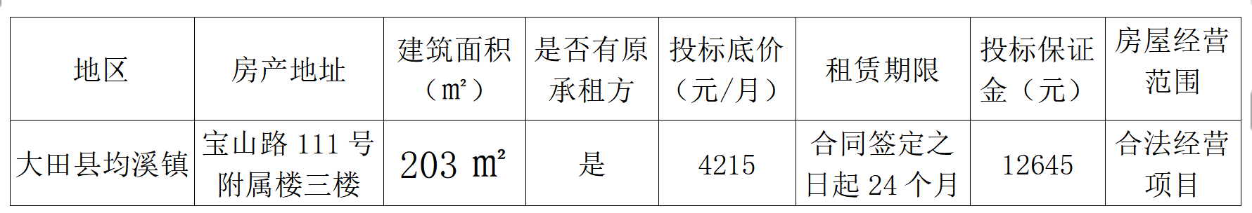 大田縣分公司所屬房產均溪鎮寶山路111號附屬樓三樓對外租賃權公開招租已進行兩輪,現轉由對外協議出租階段。歡迎有意向的機關、團體、個人前來響應。